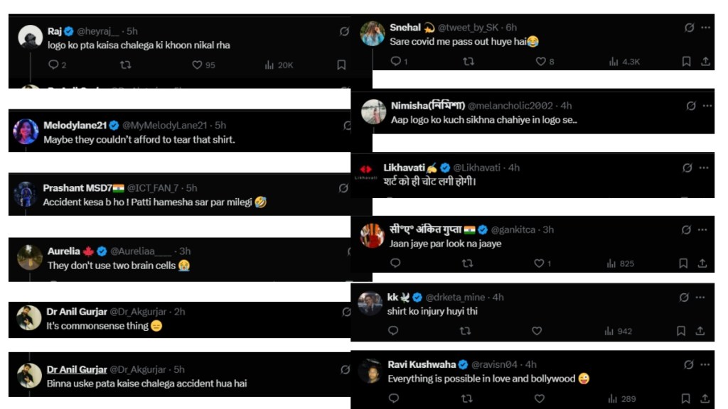 इस फोटो को शेयर करते हुए यूजर ने लिखा कि बॉलीवुड के डॉक्टर्स बहुत एडवांस हैं, शर्ट के ऊपर ड्रेसिंग और हंसने वाली इमोजी. इस पोस्ट को देखने के बाद फिल्म ट्रोलर्स के निशाने पर आ गईं. एक यूजर ने कमेंट में लिखा कि लोगों को पता कैसे चलेगा कि खून निकल रहा है? दूसरे यूजर ने कहा कि एक्सीडेंट कैसा भी हो, लेकिन पट्टी हमेशा सिर पर होती है. तीसरे यूजर ने कहा कि वो अपने दिमाग को यूज नहीं करते हैं.
