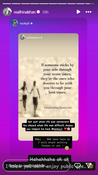 हिना ने भी रॉकी की अहमियत को अपनी लाइफ में समझा और लिखा- आप किसी ऐसे व्यक्ति के साथ रिश्ते के लायक हैं जिसके बारे में आपको कभी पता न चले कि आप उसके साथ कहां खड़े हैं। इसे स्पष्ट करें मेरे प्रिय, कृपया अपनी कीमत जानें।