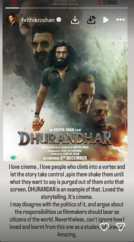 ऋतिक रोशन ने अपने इंस्टाग्राम स्टोरी पर एक पोस्ट शेयर किया है. इस पोस्ट में ऋतिक रोशन ने फिल्म ‘धुरंधर’ का रिव्यू किया है. फिल्म को लेकर ऋतिक रोशन ने लिखा कि मुझे सिनेमा पसंद है, ऐसे लोग पसंद है, जो भंवर में फंसते हैं और कहानी को कंट्रोल करने देते हैं. उसे तब तक हिलाते हैं, जब तक उन्हें जो बात कहनी है स्क्रीन पर निकलकर ना आ जाए और धुरंधर इसका उदाहरण है.