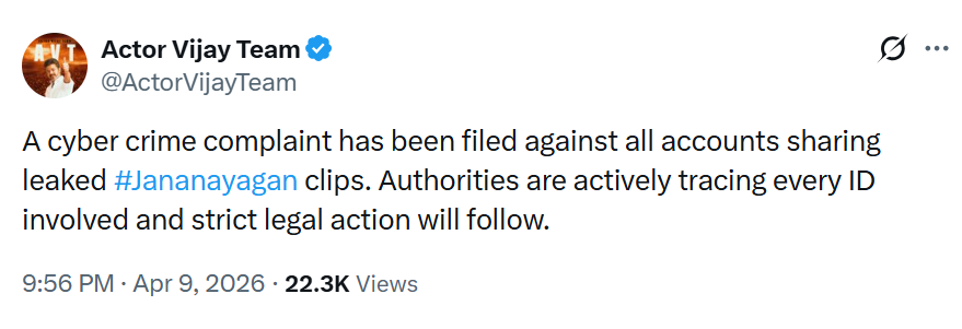 Jana Nayagan Movie Leaked: рд╕рд╛рдЙрде рд╕реБрдкрд░рд╕реНрдЯрд╛рд░ рдерд▓рд╛рдкрддрд┐ рд╡рд┐рдЬрдп рдХреА ‘рдЬрдирд╛ рдирд╛рдпрдХрди’ рдлрд┐рд░ рдЪрд░реНрдЪрд╛рдУрдВ рдореЗрдВ рдЖ рдЧрдИ рд╣реИ. рдлрд┐рд▓реНрдо рдЕрднреА рддрдХ рд╕рд┐рдиреЗрдорд╛рдШрд░реЛрдВ рдореЗрдВ рд░рд┐рд▓реАрдЬ рдирд╣реАрдВ рд╣реБрдИ рд╣реИ рд▓реЗрдХрд┐рди рдЖрдП рджрд┐рди рд╕реБрд░реНрдЦрд┐рдпреЛрдВ рдореЗрдВ рдмрдиреА рд╣реБрдИ рд╣реИ. рдЬрд╣рд╛рдВ рдПрдХ рддрд░рдл рдлрд┐рд▓реНрдо рдХреА рд░рд┐рд▓реАрдЬ рдбреЗрдЯ рдкрд░ рд╡рд┐рд╡рд╛рдж рдЪрд▓ рд░рд╣рд╛ рдерд╛, рд╡рд╣реАрдВ рдЕрдм рджреВрд╕рд░реА рддрд░рдл рдлрд┐рд▓реНрдо рдХреА рд▓реАрдХ рд╣реЛрдиреЗ рдХреА рдЦрдмрд░ рд╕рд╛рдордиреЗ рдЖ рд░рд╣реА рд╣реИ. рдЬреА рд╣рд╛рдВ рдЦрдмрд░реЗрдВ рд╣реИрдВ рдХрд┐ рдерд▓рд╛рдкрддрд┐ рд╡рд┐рдЬрдп рдХреА ‘рдЬрдирд╛ рдирд╛рдпрдХрди’ рдлрд┐рд▓реНрдо рдХрд╛ 5 рдорд┐рдирдЯ рдХрд╛ рд╕реАрди рд▓реАрдХ рд╣реЛ рдЧрдпрд╛ рд╣реИ. рд╕реЛрд╢рд▓ рдореАрдбрд┐рдпрд╛ рдкрд░ рд▓реАрдХ рд╣реБрдЖ рдпреЗ рд╕реАрди рдХрд╛рдлреА рд╡рд╛рдпрд░рд▓ рд╣реЛ рд░рд╣рд╛ рд╣реИ. рд╡рд╣реАрдВ рдореЗрдХрд░реНрд╕ рдиреЗ рднреА рдЗрд╕ рдкрд░ рдирд╛рд░рд╛рдЬрдЧреА рдЬрддрд╛рдИ рд╣реИ. рдЪрд▓рд┐рдП рдЖрдкрдХреЛ рднреА рдмрддрд╛рддреЗ рд╣реИрдВ рдЖрдЦрд┐рд░ рдкреВрд░рд╛ рдорд╛рдорд▓рд╛ рдХреНрдпрд╛ рд╣реИ?