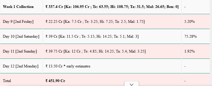 Sacnilk की रिपोर्ट के अनुसार 12वें दिन ऋषभ शेट्टी की ‘कांतारा चैप्टर 1’ ने 13.50 करोड़ की कमाई की. हालांकि वीकेंड के मुकाबले ये आंकड़े कम नजर आए. 12 दिनों में भारत में ऋषभ शेट्टी की फिल्म ने 451.90 करोड़ का कलेक्शन कर लिया है. वहीं अपकमिंग वीकेंड पर भी फिल्म की कमाई में उछाल देखने को मिल सकता है. ओपनिंग डे पर 61.85 करोड़ की कमाई करने वाली ‘कांतारा चैप्टर 1’ ने पहले वीक में 337.4 करोड़ की कमाई की.