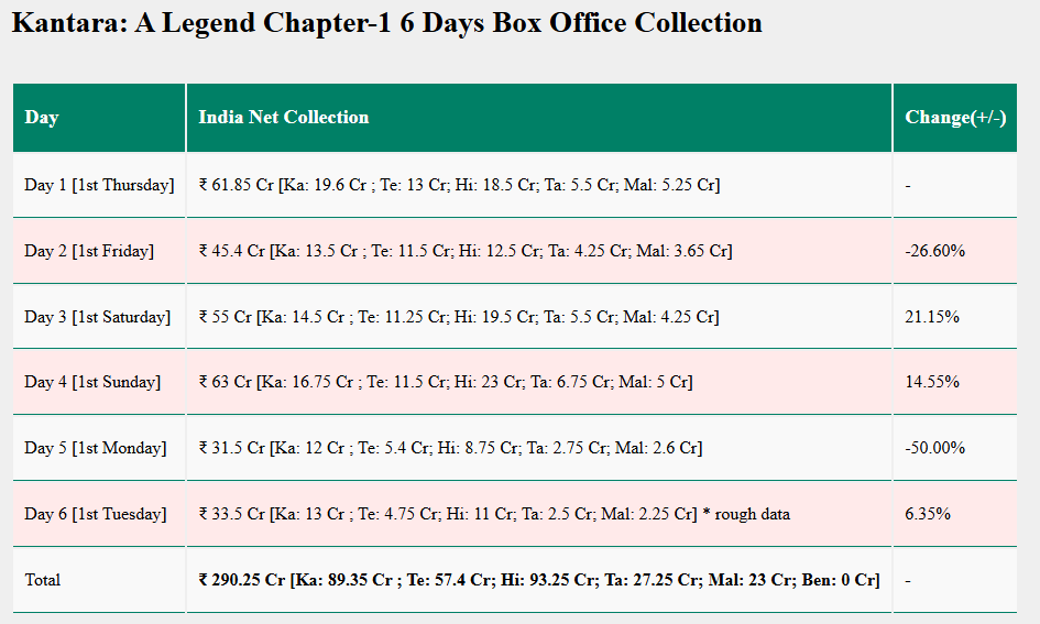 Sacnilk की रिपोर्ट के अनुसार ‘कांतारा चैप्टर 1’ ने छठे दिन बॉक्स ऑफिस पर 33.5 करोड़ की कमाई की. भारत में फिल्म ने 6 दिनों में 290.25 करोड़ की कमाई कर ली है. वहीं दूसरी ओर वर्ल्डवाइड कलेक्शन की बात करें तो दुनिया भर में ऋषभ शेट्टी की फिल्म ने 407 करोड़ की मोटी कमाई कर ली है. इतनी कमाई करने के बाद ये फिल्म इस साल की बड़ी फिल्मों की लिस्ट में शामिल हो गई है.