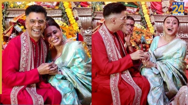 हर साल की तरह इस बार भी बॉलीवुड एक्ट्रेस काजोल अपने दुर्गा पंडाल को लेकर सुर्खियों में छाई हुई हैं. दुर्गा पूजा में बॉलीवुड की कई जानी-मानी हस्तियों ने शिरकत की. वहीं रानी मुखर्जी और करण जौहर का एक वीडियो भी दुर्गा पंडाल से खूब वायरल हो रहा है. इसमें दोनों की जोड़ी को साथ देखकर फैंस को ‘कुछ-कुछ होता है’ मूवी की याद आ गई. करण जौहर पूजा के दौरान रानी मुखर्जी के साथ गपशप करते नजर आ रहे हैं. वहीं इस दौरान वीडियो में देखने को मिला, रानी को करण की अंगूठी काफी पसंद आई जिसके बाद करण ने अपनी अंगूठी उतारकर रानी को पहना दी. इस मोमेंट ने फैंस का दिल जीत लिया.