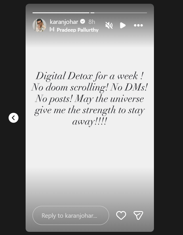 рдХрд░рдг рдЬреМрд╣рд░ рдиреЗ рдЕрдкрдиреЗ Digital Detox рдХреА рдЬрд╛рдирдХрд╛рд░реА рдЗрдВрд╕реНрдЯрд╛рдЧреНрд░рд╛рдо рдкрд░ рджреА рд╣реИ. рдЗрд╕рдореЗрдВ рдЙрдиреНрд╣реЛрдВрдиреЗ рд▓рд┐рдЦрд╛ рдХрд┐ рд╡реЗ рд╣рдлреНрддреЗрднрд░ рдХреЗ рд▓рд┐рдП рд╕реЛрд╢рд▓ рдореАрдбрд┐рдпрд╛ рд╕реЗ рдмрд┐рд▓реНрдХреБрд▓ рджреВрд░ рд░рд╣реЗрдВрдЧреЗ. рд╡реЗ рдирд╛ рд╣реА рдХреЛрдИ рд╕реНрдЯреЛрд░реА рд▓рдЧрд╛рдПрдВрдЧреЗрдВ рдФрд░ рди рд╣реА рдХрд┐рд╕реА рддрд░рд╣ рдХрд╛ рдкреЛрд╕реНрдЯ рдХрд░реЗрдВрдЧреЗ. рдЗрддрдирд╛ рд╣реА рдирд╣реАрдВ рд╡реЗ рдХрд┐рд╕реА рднреА рд╡реНрдпрдХреНрддрд┐ рдХрд╛ рдЙрдирдХреЗ DMs рдореЗрдВ рд░рд┐рдкреНрд▓рд╛рдИ рддрдХ рдирд╣реАрдВ рджреЗрдВрдЧреЗ.