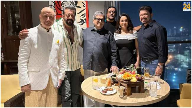 लेकिन अब सुभाष घई की पार्टी ने वो कर दिखाया जो कोई नहीं कर पाया। अब इस पार्टी में माधुरी अपने 2 लवर्स के साथ नज़र आ रही हैं। इनमें एक तो उनके एक्स लवर संजय दत्त हैं। वहीं, इसी फ्रेम में एक्ट्रेस के पति भी दिखाई दे रहे हैं। अब इन्हें साथ देखकर फैंस तरह-तरह की बातें करते दिखाई दे रहे हैं। इसके अलावा इन फोटोज को देखकर ऐसा लग रहा है जैसे पूरी 'खलनायक' टीम का रीयूनियन हो गया है। अनुपम खेर भी इनके साथ पार्टी में मौजूद थे।