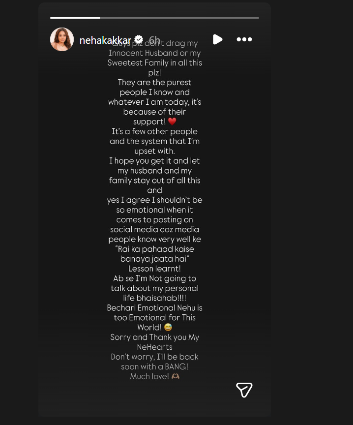 सिंगर ने आगे कहा, 'हाँ, मैं मानती हूं कि सोशल मीडिया पर पोस्ट करते समय मुझे इतना भावुक नहीं होना चाहिए, क्योंकि मीडिया वाले अच्छी तरह जानते हैं कि राई का पहाड़ कैसे बनाया जाता है. मैंने सबक सीख लिया है. अब से मैं अपनी निजी जिंदगी के बारे में बात नहीं करने वाली हूं. बेचारी भावुक नेहू इस दुनिया के लिए बहुत भावुक है. माफी और धन्यवाद मेरे दोस्तों. चिंता मत करो मैं जल्द ही धमाके के साथ वापस आऊंगी, ढेर सारा प्यार.'