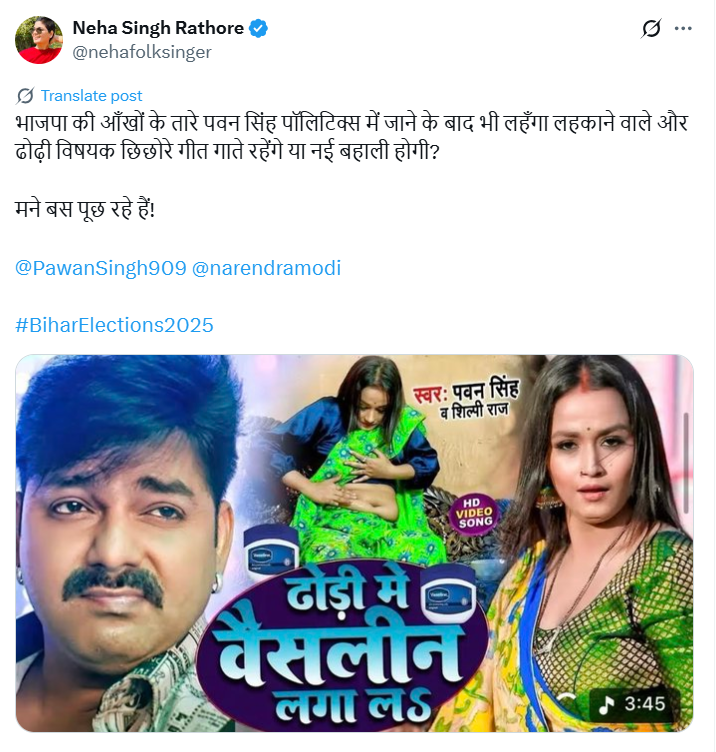वहीं, भोजपुरी की लोकगायिका नेहा सिंह राठौर बीजेपी या फिर पार्टी के नेताओं को घेरने का एक भी मौका हाथ से जाने नहीं देती हैं. अब उन्होंने अश्लील गानों को लेकर अपनी पोस्ट से पवन सिंह पर निशाना साधा है और सवाल किया है. हालांकि, इस पर पवन सिंह का या फिर पार्टी की ओर से कोई रिएक्शन नहीं आया है. नेहा ने पवन के एक गाने का पोस्टर शेयर किया है, जिसका टाइटल ‘ढोढ़ी में वैसलीन लगा ला’ है. इसी को साझा करने के साथ ही उन्होंने पोस्ट में लिखा, ‘भाजपा की आंखों के तारे पवन सिंह पॉलिटिक्स में जाने के बाद भी लहंगा लहकाने वाले और ढोढ़ी विषयक छिछोरे गीत गाते रहेंगे या नई बहाली होगी? मने बस पूछ रहे हैं!’
