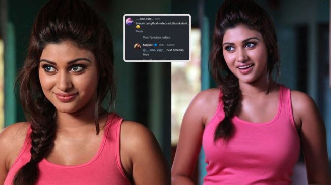 ओविया द्वारा शेयर की गई इंस्टाग्राम फोटो के कमेंट सेक्शन में एक ट्रोलर ने उन्हें ट्रोल करने की कोशिश की। कॉमेंट सेक्शन में ट्रोलर ने ओविया से कहा कि अपने वायरल वीडियो का पूरा वीडियो भेजो। इसका जवाब देते हुए ओविया ने लिखा, “अगली बार भाई।” इसके बाद एक्ट्रेस ने अपने फोटो का कॉमेंट सेक्शन बंद कर दिया। ओविया के कमेंट सेक्शन बंद करने से पहले ही ट्रोलर और ओविया के बातचीत का स्क्रीनशॉट ट्विटर पर वायरल हो गया। हालांकि एक्ट्रेस ने अब अपने पोस्ट के कॉमेंट सेक्शन को फिर सो पब्लिक कर दिया है।
