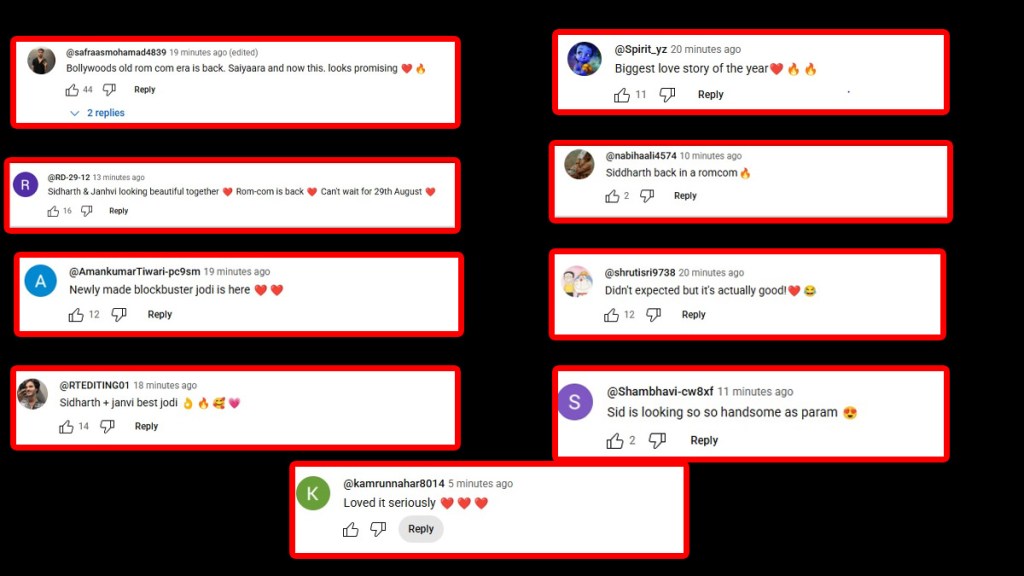 वहीं, तीसरे यूजर ने कहा कि सिद्धार्थ-जान्हवी साथ में बेहद शानदार लग रहे हैं। चौथे यूजर ने कहा कि न्यूली ब्लॉकबस्टर जोड़ी इज कमिंग। एक और यूजर ने कहा कि सिद्धार्थ-जान्हवी बेस्ट जोड़ी। एक ने कहा कि साल की सबसे बड़ी लव स्टोरी। एक और ने कहा कि सिद्धार्थ फिर से रॉम-कॉम में। इस तरह कमेंट्स के जरिए लोगों ने ट्रेलर की तारीफ की है।
