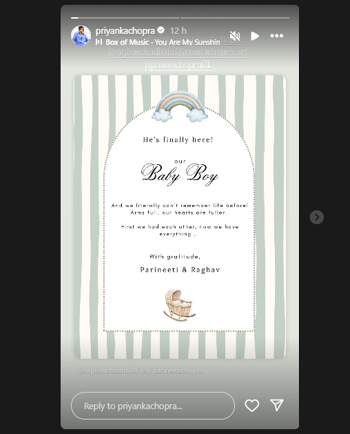 प्रियंका चोपड़ा ने अपनी इंस्टाग्राम स्टोरी पर राघव चड्ढा की पोस्ट को रिशेयर किया. प्रियंका ने बधाई देते हुए परिणीति चोपड़ा और राघव चड्ढा को टैग भी किया. मौसी बनकर प्रियंका काफी खुश नजर आईं. बेबी बॉय के आने से अब प्रियंका की बेटी मालती को भी भाई मिल गया है. वहीं प्रियंका के साथ-साथ बॉलीवुड के कई सितारे राघव चड्ढा की पोस्ट पर कमेंट कर कपल को इस खुशखबरी की बधाई दे रहे हैं.