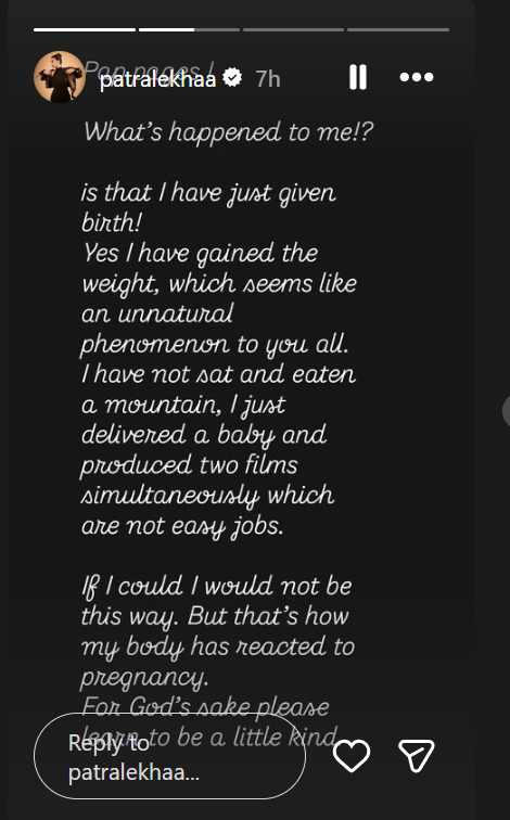 पत्रलेखा ने लिखा, “पैप्स पेजेस! मेरे साथ क्या हुआ है? मैंने अभी-अभी एक बच्चे को जन्म दिया है. हां, मेरा वजन बढ़ गया है. यह आपको अजीब लग रहा होगा, लेकिन मैंने बैठकर कोई पहाड़ नहीं खाया है. मैंने सिर्फ बच्चे को जन्म दिया और साथ ही दो फिल्मों का प्रोडक्शन भी किया है.”