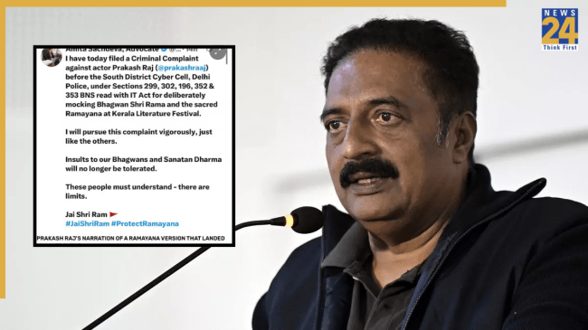 भगवान राम और पवित्र महाकाव्य का मजाक उड़ाने के आरोप में साउथ सुपरस्टार प्रकाश राज पर 16 अप्रैल 2026 को शिकायत दर्ज कराई गई है. उन पर आरोप लगाया गया है कि एक्टर ने हिंदुओं की भावनाओं को जानबूझकर आहत पहुंचाई है. दरअसल , यह मामला दिल्ली पुलिस के साउथ डिस्ट्रिक्ट साइबर सेल में दर्ज कराई गई है. वहीं वकील अमिता सचदेवा ने सोशल मीडिया प्लेटफॉर्म X जानकारी दी है कि एक्टर के खिलाफ भारतीय न्याय संहिता की धारा 299, 302, 196, 352 और 353 के तहत आईटी एक्ट के साथ मामला दर्ज कराया गया है.
