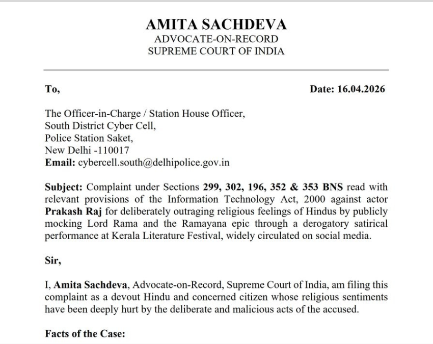 प्रकाश राज के खिलाफ 16 अप्रैल 2026 को दिल्ली पुलिस के साउथ डिस्ट्रिक्ट साइबर सेल में शिकायत दर्ज की गई है.