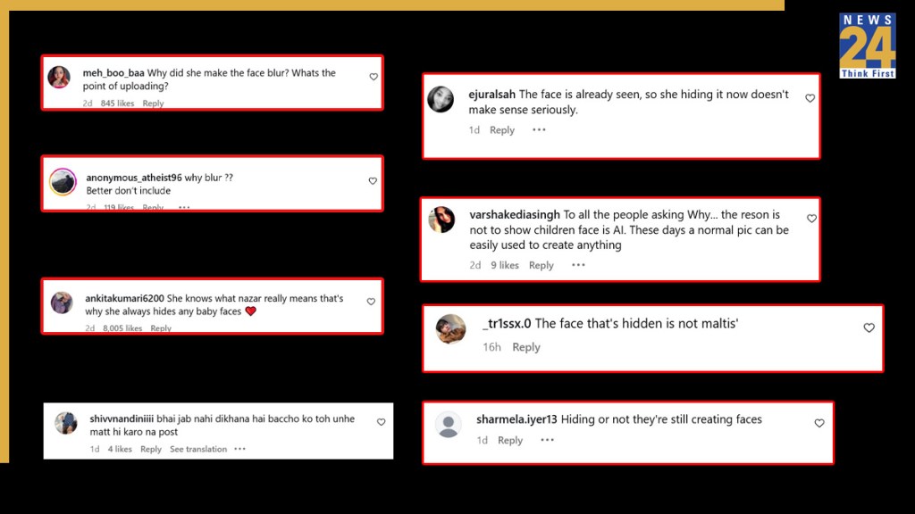 एक यूजर ने इन फोटोज को देखने के बाद कमेंट किया कि जब चेहरा पहले ही दिखा चुकी हो, तो फिर दोबारा हाइड करने का क्या मतलब? दूसरे यूजर ने कहा कि जब बच्चों को दिखाना ही नहीं है, तो उनकी फोटो पोस्ट ही ना करो. तीसरे यूजर ने लिखा कि उन्हें पता है कि नजर सच में क्या होती है? इसलिए वो हमेशा बच्चों के चेहरे को हाइड करती है. एक यूजर ने लिखा कि ब्लर क्यों है? इससे अच्छा पोस्ट ही ना करो.