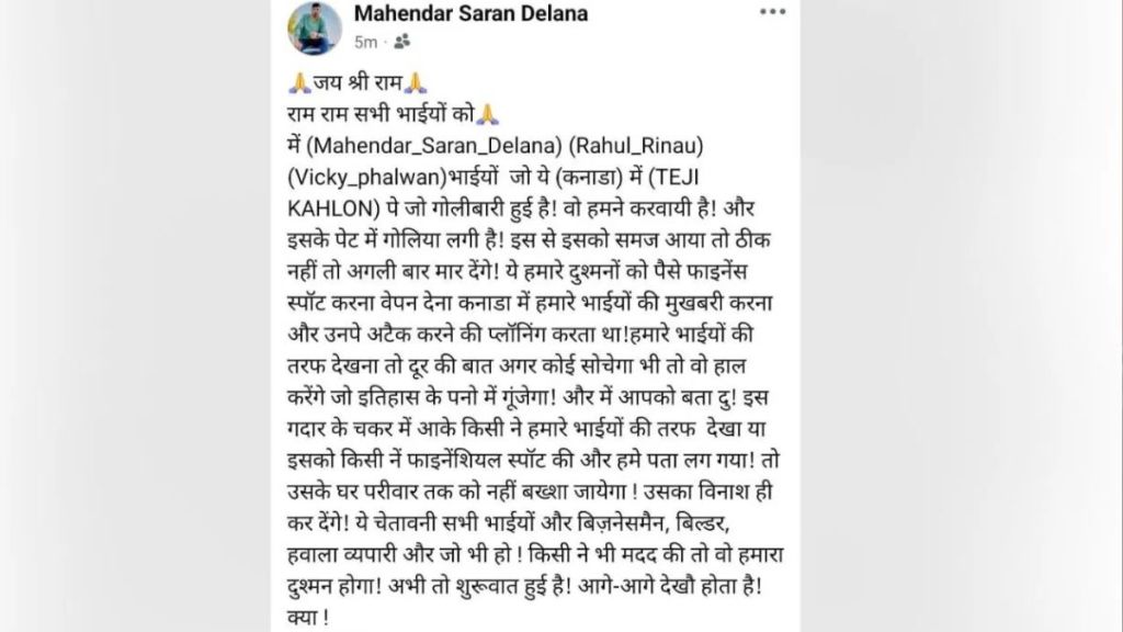 रिपोर्ट्स के अनुसार महेन्द्र सरन नाम के एक गैंगस्टर ने सोशल मीडिया पर पोस्ट शेयर की है. ये गैंगस्टर रोहित गोदारा गैंग से जुड़ा है. उसने पोस्ट में लिखा, ‘तेजी कहलों पर जो भी हमला हुआ है वो हमने करवाया है. तेजी कहलों के पेट में गोलियां लगी हैं. ये चेतावनी भरा हमला था, अगर इसके बाद भी उसे समझ नहीं आया तो उसका खेल खत्म कर देंगे. ये हमारे दुश्मनों को वेपन सप्लाई करता था और हमारी मुखबरी करवाता था, इसलिए इस पर हमला करवाया गया है.’
