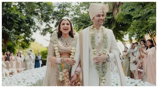 Parineeti Chopra Raghav Chadha Wedding: बॉलीवुड एक्ट्रेस परिणीति चोपड़ा और राघव चड्ढा 24 सितंबर को शादी के बंधन में बंध गई है। जैसे ही कपल की शादी की फोटोज सामने आई, तो सोशल मीडिया पर वायरल हो गई। फैंस को कपल की जोड़ी बेहद पसंद आ रही है।