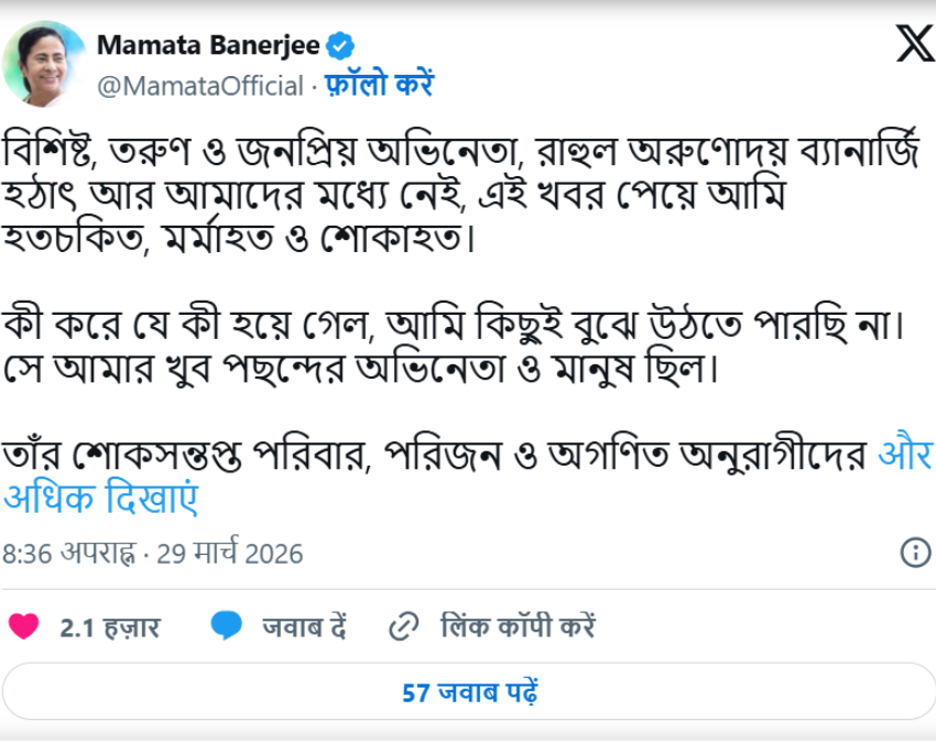 बंगाली मशहूर एक्टर राहुल बनर्जी के निधन पर सीएम ममता बनर्जी ने शोक जताया है. उन्होंने एक्टर के निधन पर शोक जताते हुए एक्स पर लिखा, ‘मुझे कुछ समझ नहीं आ रहा है कि यह सब कैसे हो गया वह मेरे पसंदीदा कलाकारों में से एक थे और वो एक बेहतरीन इंसान भी थें.
