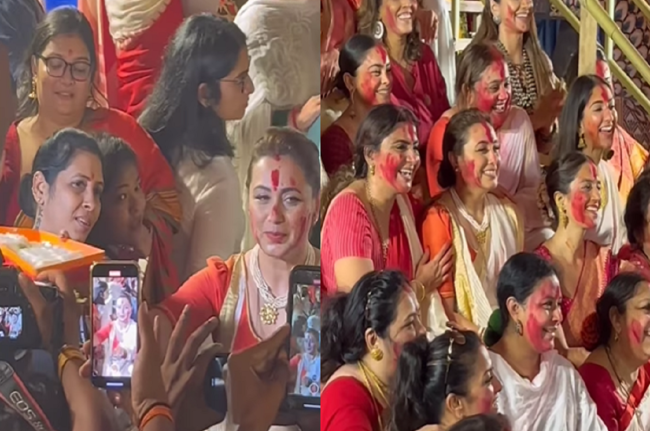 सोशल मीडिया पर एक वीडियो वायरल (Rani Mukherjee Viral Video) हो रहा है, जिसमें दुर्गा पूजा के बाद दशहरा के मौके पर, रानी मुखर्जी को उनकी बहनों के साथ जुहू के एक पंडाल में ‘सिंदूर खेला’ का आनंद लेते हुए देखा गया।