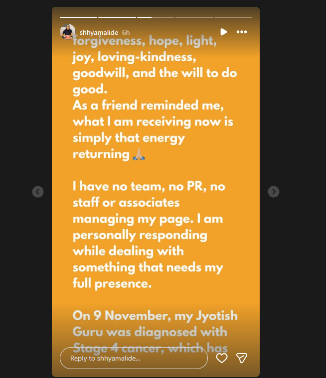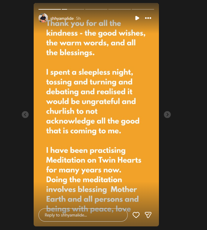 श्यामाली ने आगे कहा कि मेरे पास कोई टीम नहीं है ना ही कोई पीआर टीम जो मेरा अकाउंट चला रहा है. मैं खुद ही इस टॉपिक पर प्रतिक्रिया दे रही हूं. मुझे ऐसे मुद्दे से बाहर निकलना है इसलिए में इस पर रिएक्ट करते हुए इस मुद्दे को शांत कर रही हूं. इसके बाद श्यामाली ने उन सभी लोगों को धन्यवाद कहा जिन लोगों ने उनका सपोर्ट किया. सोशल मीडिया पर श्यामाली की पोस्ट खूब वायरल हो रही है.
