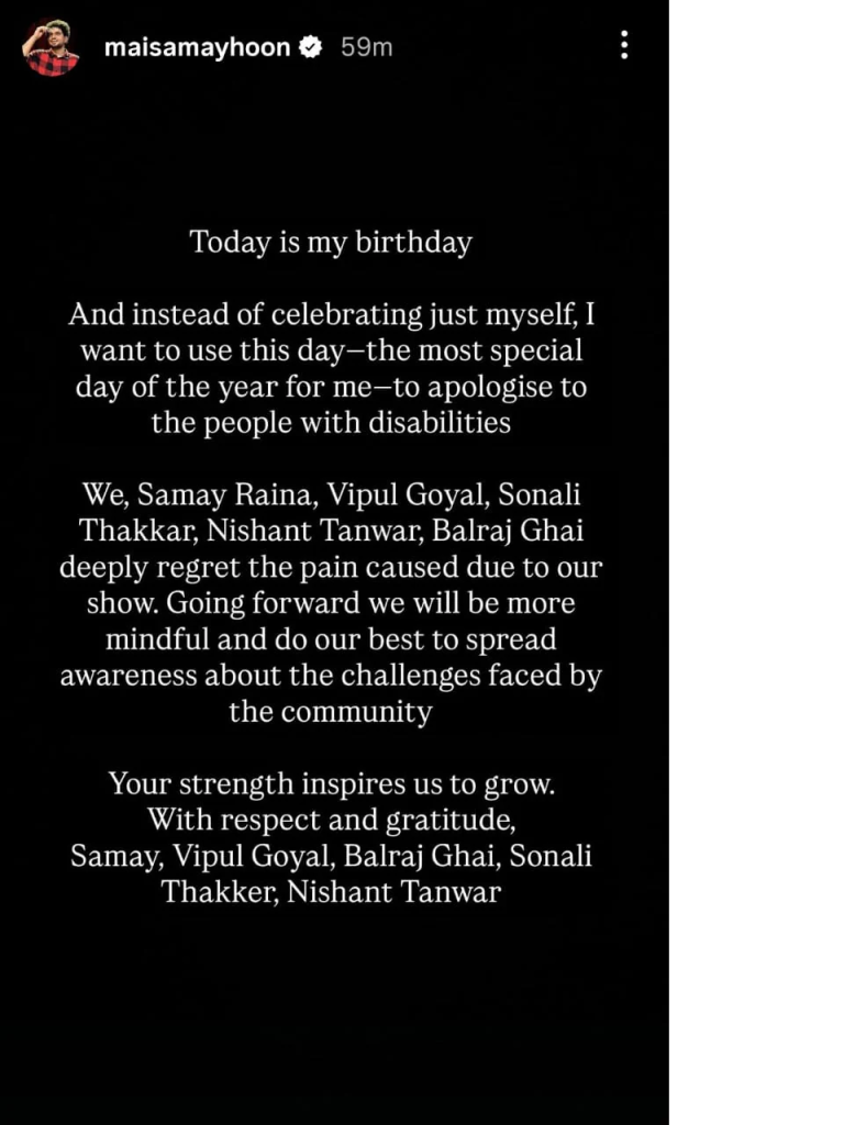 рджрд░рдЕрд╕рд▓, рд╕рдордп рд░реИрдирд╛ рдиреЗ рдЕрдкрдиреЗ рдЗрдВрд╕реНрдЯрд╛рдЧреНрд░рд╛рдо рдкрд░ рдмрд░реНрдердбреЗ рдкрд░ рдПрдХ рдкреЛрд╕реНрдЯ рд╢реЗрдпрд░ рдХрд┐рдпрд╛ рдерд╛. рдЗрд╕ рдкреЛрд╕реНрдЯ рдореЗрдВ рд╕рдордп рдиреЗ рд▓рд┐рдЦрд╛ рдХрд┐ рдЖрдЬ рдореЗрд░рд╛ рдЬрдиреНрдорджрд┐рди рд╣реИ рдФрд░ рдЖрдЬ рдореИрдВ рдЗрд╕реЗ рд╕реЗрд▓рд┐рдмреНрд░реЗрдЯ рдХрд░рдиреЗ рдХреЗ рдмрдЬрд╛рдп рд╡рд┐рдХрд▓рд╛рдВрдЧ рд▓реЛрдЧреЛрдВ рд╕реЗ рдорд╛рдлреА рдорд╛рдВрдЧрдирд╛ рдЪрд╛рд╣рддрд╛ рд╣реВрдВ. рд╣рдо, рд╕рдордп рд░реИрдирд╛, рд╡рд┐рдкреБрд▓ рдЧреЛрдпрд▓, рд╕реЛрдирд╛рд▓реА рдардХреНрдХрд░, рдирд┐рд╢рд╛рдВрдд рддрдВрд╡рд░, рдмрд▓рд░рд╛рдЬ рдШрдИ, рдЕрдкрдиреЗ рд╢реЛ рдХреА рд╡рдЬрд╣ рд╕реЗ рд╣реБрдИ рдкрд░реЗрд╢рд╛рдиреА рдХреЗ рд▓рд┐рдП рдЖрдк рд▓реЛрдЧреЛрдВ рд╕реЗ рдорд╛рдлреА рдорд╛рдВрдЧрддреЗ рд╣реИрдВ.