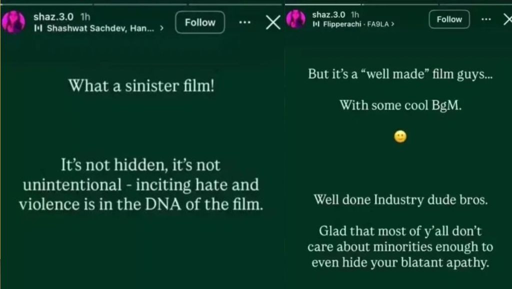 рд░рдгрд╡реАрд░ рд╕рд┐рдВрд╣ рдХреА ‘рдзреБрд░рдВрдзрд░’ рд╣рд╛рд▓ рд╣реА рдореЗрдВ рдиреЗрдЯрдлреНрд▓рд┐рдХреНрд╕ рдкрд░ рд░рд┐рд▓реАрдЬ рд╣реБрдИ рд╣реИ. рд╢рд╛рдЬрд┐рдпрд╛ рдиреЗ рдЗрд╕реЗ рджреЗрдЦрдХрд░ рд╕реЛрд╢рд▓ рдореАрдбрд┐рдпрд╛ рдкрд░ рдкреЛрд╕реНрдЯ рд╢реЗрдпрд░ рдХрд░рддреЗ рд╣реБрдП рдЖрджрд┐рддреНрдп рдзрд░ рдХреЗ рдбрд╛рдпрд░реЗрдХреНрд╢рди рдореЗрдВ рдмрдиреАрдВ ‘рдзреБрд░рдВрдзрд░’ рдкрд░ рд╣рдорд▓рд╛ рдмреЛрд▓ рджрд┐рдпрд╛. рд╢рд╛рдЬрд┐рдпрд╛ рдиреЗ рдЗрдВрд╕реНрдЯрд╛рдЧреНрд░рд╛рдо рд╕реНрдЯреЛрд░реА рдкрд░ рдкреЛрд╕реНрдЯ рд╢реЗрдпрд░ рдХрд░рддреЗ рд╣реБрдП рдЗрд╕ рдлрд┐рд▓реНрдо рдХреЛ ‘рдШрд┐рдиреМрдирд╛’ рдмреЛрд▓ рджрд┐рдпрд╛. рд╣рд╛рд▓рд╛рдВрдХрд┐ рд╢рд╛рдЬрд┐рдпрд╛ рдиреЗ рдЗрд╕ рдлрд┐рд▓реНрдо рдХрд╛ рдирд╛рдо рдирд╣реАрдВ рд▓рд┐рдпрд╛, рдмрд▓реНрдХрд┐ рдлрд┐рд▓реНрдо рдХрд╛ рдЧрд╛рдирд╛ рдЕрдкрдиреА рд╕реНрдЯреЛрд░реА рдкрд░ рд▓рдЧрд╛рддреЗ рд╣реБрдП рдмрд┐рдирд╛ рдирд╛рдо рд▓рд┐рдП рдлрд┐рд▓реНрдо рдХреА рдЖрд▓реЛрдЪрдирд╛ рдХреА. рдЬрд┐рд╕рдХреЗ рдмрд╛рдж рд╕реЗ рд╢рд╛рдЬрд┐рдпрд╛ рдЯреНрд░реЛрд▓рд░реНрд╕ рдХреЗ рдирд┐рд╢рд╛рдиреЗ рдкрд░ рдЖ рдЧрдИрдВ.