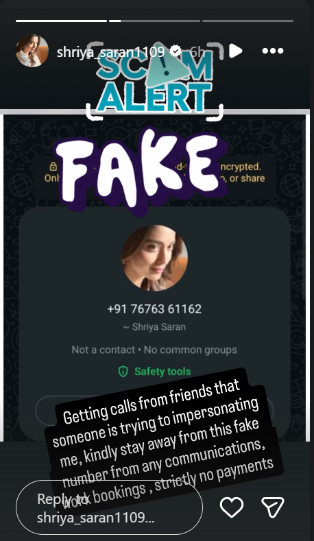 श्रिया सरन ने आगे लिखा कि ये मैं नहीं हूं और ना ही ये मेरा नंबर है. ये इंसान उन लोगों तक जा रहा है, जिनकी मैं रिस्पेक्ट करती हूं या जिनके साथ मैं काम करना चाहती हूं. ये बहुत अजीब है, तुम ऐसा करने में अपना समय क्यों बर्बाद कर रहे हो? जाओ, जिंदगी जियो, किसी को परेशान ना करो. इसके अलावा एक्ट्रेस ने अपने इंस्टाग्राम पर भी एक स्टोरी पोस्ट करके इससे दूर रहने की सलाह दी है और सतर्क रहने को कहा है.