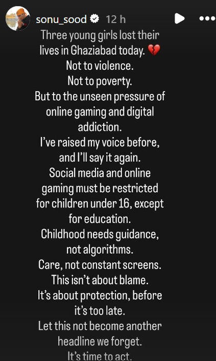 सोनू सूद ने इस मामले पर बात करते हुए इंस्टाग्राम स्टोरी पर पोस्ट शेयर की. एक्टर ने पोस्ट में लिखा, 'आज गाजियाबाद में तीन युवतियों की जान चली गई. इनकी जान हिंसा या गरीबी से नहीं, बल्कि ऑनलाइन गेमिंग और डिजिटल लत के अनदेखे दबाव से गई है. मैंने पहले भी आवाज उठाई है और मैं फिर से कह रहा हूं. शिक्षा को छोड़कर, 16 साल से कम उम्र के बच्चों के लिए सोशल मीडिया और ऑनलाइन गेमिंग पर बैन लगाया जाना चाहिए.'