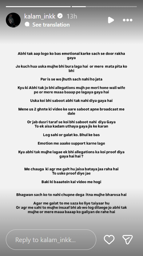 рдЗрд╕рдХреЗ рдЖрдЧреЗ рдХрд▓рдо рдиреЗ рдПрдХ рдФрд░ рдкреЛрд╕реНрдЯ рд╢реЗрдпрд░ рдХрд┐рдпрд╛ рд╣реИ, рдЬрд┐рд╕рдореЗрдВ рдЙрдиреНрд╣реЛрдВрдиреЗ рд▓рд┐рдЦрд╛ рд╣реИ рдХрд┐ рдЕрднреА рддрдХ рдЖрдк рд▓реЛрдЧреЛрдВ рдХреЛ рдмрд╕ рдЗрдореЛрд╢рдирд▓ рдХрд░рдХреЗ рд╕рдЪ рд╕реЗ рджреВрд░ рд░рдЦрд╛ рдЧрдпрд╛ рд╣реИ, рдЬреЛ рдХреБрдЫ рд╣реБрдЖ рдЙрд╕рдХрд╛ рдореБрдЭреЗ рднреА рдмреБрд░рд╛ рд▓рдЧрд╛ рд╣реИ рдФрд░ рдореЗрд░реЗ рдорд╛рддрд╛-рдкрд┐рддрд╛ рдХреЛ рднреА, рд▓реЗрдХрд┐рди рдЗрд╕рд╕реЗ рд╡реЛ рдЭреВрда рд╕рдЪ рдирд╣реАрдВ рд╣реЛ рдЬрд╛рддрд╛. рдЕрднреА рддрдХ рдЬреЛ рднреА рдЖрд░реЛрдк рдореБрдЭ рдкрд░ рд▓рдЧреЗ, рдореЗрд░реА рд╣реЛрдиреЗ рд╡рд╛рд▓реА рд╡рд╛рдЗрдл рдФрд░ рдореЗрд░реЗ рдорд╛рдВ-рдмрд╛рдк рдкрд░ рд▓рдЧрд╛рдП рдЧрдП рд╣реИрдВ, рдЙрд╕рдХрд╛ рдХреЛрдИ рднреА рд╕рдмреВрдд рдирд╣реАрдВ рджрд┐рдпрд╛ рдЧрдпрд╛ рд╣реИ.