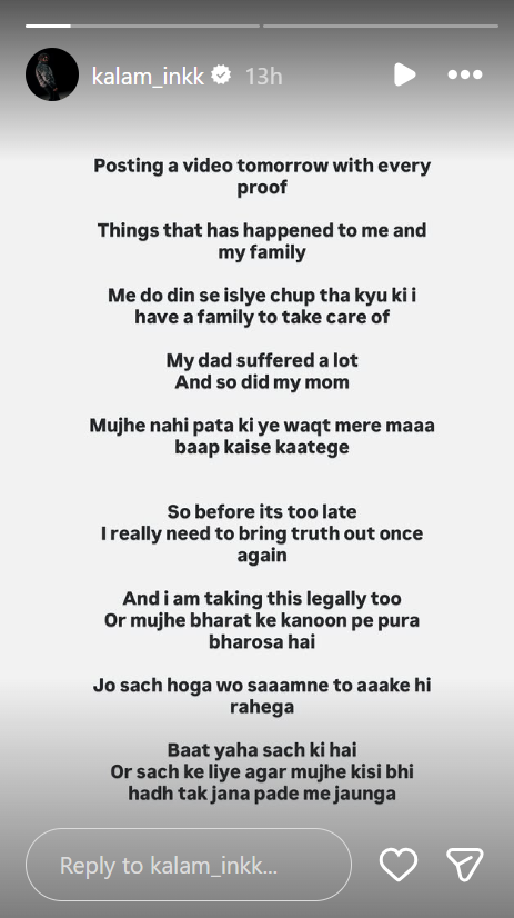 рдХрд▓рдо рдЗрдВрдХ рдиреЗ рдЕрдкрдиреЗ рдЗрдВрд╕реНрдЯрд╛рдЧреНрд░рд╛рдо рд╕реНрдЯреЛрд░реА рдкрд░ рдПрдХ рдкреЛрд╕реНрдЯ рд╢реЗрдпрд░ рдХрд┐рдпрд╛ рд╣реИ. рдЗрд╕ рдкреЛрд╕реНрдЯ рдореЗрдВ рдХрд▓рдо рдиреЗ рд▓рд┐рдЦрд╛ рд╣реИ рдХрд┐ рдХрд▓ рд╕рднреА рд╕рдмреВрддреЛрдВ рдХреЗ рд╕рд╛рде рдПрдХ рд╡реАрдбрд┐рдпреЛ рдкреЛрд╕реНрдЯ рдХрд░реВрдВрдЧрд╛, рдореЗрд░реЗ рдФрд░ рдореЗрд░реЗ рдкрд░рд┐рд╡рд╛рд░ рдХреЗ рд╕рд╛рде рдЬреЛ рднреА рд╣реБрдЖ рд╣реИ рдЙрд╕реЗ рд▓реЗрдХрд░. рдореИрдВ рджреЛ рджрд┐рди рд╕реЗ рдЗрд╕рд▓рд┐рдП рдЪреБрдк рдерд╛ рдХреНрдпреЛрдВрдХрд┐ рдореЗрд░рд╛ рдкрд░рд┐рд╡рд╛рд░ рд╣реИ, рдЬрд┐рд╕рдХреА рджреЗрдЦрд░реЗрдЦ рдореБрдЭреЗ рд╣реА рдХрд░рдиреА рд╣реИ. рдореЗрд░реЗ рдорд╛рддрд╛-рдкрд┐рддрд╛ рдиреЗ рдмрд╣реБрдд рдХреБрдЫ рд╕рд╣рд╛ рд╣реИ.