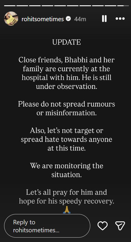 अनुराग डोभाल के मैनेजर ने अपने इंस्टाग्राम अकाउंट पर एक लेटेस्ट स्टोरी पोस्ट की है. इस पोस्ट में रोहित पांडे ने जानकारी दी है कि उनके करीबी दोस्त, भाभी और उनका परिवार इस समय अस्पताल में उनके साथ हैं और वो अभी भी ऑब्जर्वेशन में हैं. पोस्ट में उन्होंने आगे लिखा कि प्लीज अफवाहें या गलत जानकारी ना फैलाएं.