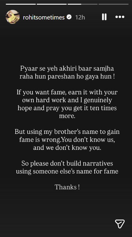 रोहित ने आगे लिखा कि मेरे भाई के नाम पर फेम पाना गलत है. हम आपको नहीं जानते और आप हमें नहीं. इसलिए प्लीज फेम के लिए किसी के नाम को यूज करके फालतू की कहानी ना बनाएं, थैंक्स. अनुराग के मैनेजर ने अपने पोस्ट में झूठी अफवाह फैलाने वालों को आखिरी चेतावनी दी है और कहा है कि वो आखिरी बार प्यार से समझा रहे हैं.