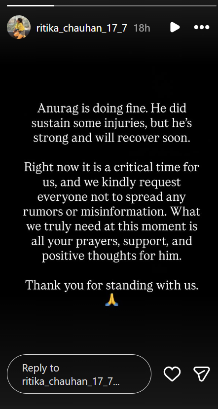 рдЗрд╕ рдкреЛрд╕реНрдЯ рдХреЛ рд╢реЗрдпрд░ рдХрд░рддреЗ рд╣реБрдП рдПрдХ рдХреИрдкреНрд╢рди рднреА рд▓рд┐рдЦрд╛ рдЧрдпрд╛ рд╣реИ. рдкреЛрд╕реНрдЯ рдХреЛ рд╢реЗрдпрд░ рдХрд░рддреЗ рд╣реБрдП рд▓рд┐рдЦрд╛ рдЧрдпрд╛ рд╣реИ рдХрд┐ рдЕрдиреБрд░рд╛рдЧ рдХреЗ рд▓рд┐рдП рдкреНрд░рд╛рд░реНрдердирд╛ рдХрд░реЗрдВ, рдЬреЛ рдЕрдкрдиреА рд▓рд╛рдЗрдл рдХреЗ рд▓рд┐рдП рд╕рдВрдШрд░реНрд╖ рдХрд░ рд░рд╣рд╛ рд╣реИ. рдЗрд╕рдХреЗ рдЕрд▓рд╛рд╡рд╛ рдЗрд╕ рдкреЛрд╕реНрдЯ рдореЗрдВ рдФрд░ рдХреЛрдИ рдЬрд╛рдирдХрд╛рд░реА рдирд╣реАрдВ рд╣реИ. рд╡рд╣реАрдВ, рдЕрдЧрд░ рдЕрдиреБрд░рд╛рдЧ рдХреЗ рдореИрдиреЗрдЬрд░ рдХреА рдмрд╛рдд рдХрд░реЗрдВ рддреЛ рдЙрдиреНрд╣реЛрдВрдиреЗ рднреА рдЕрдкрдиреЗ рдЗрдВрд╕реНрдЯрд╛рдЧреНрд░рд╛рдо рдкрд░ рдПрдХ рдкреЛрд╕реНрдЯ рд╢реЗрдпрд░ рдХрд┐рдпрд╛ рд╣реИ.