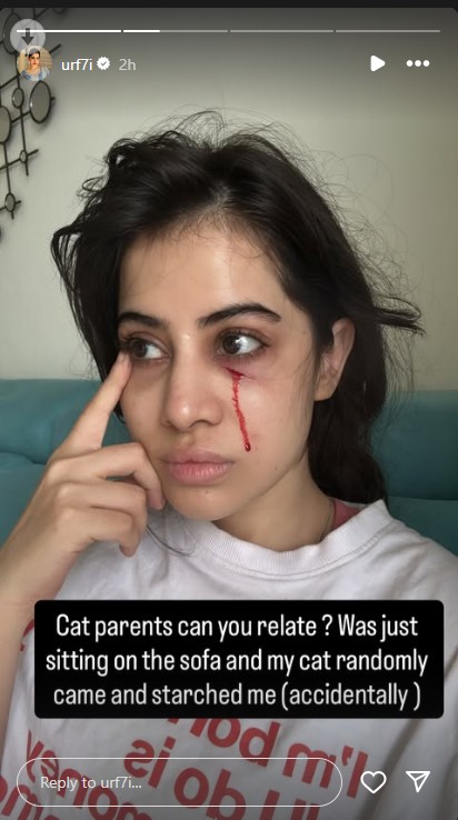 उर्फी जावेद ने इस फोटो को शेयर करते हुए लिखा, ‘कैट पेरेंट्स क्या आप रिलेट कर सकते हैं? सिर्फ सोफे पर बैठी हुई थी और मेरी कैट अचानक से आई और मुझे नोच लिया (गलती से)।’ इस फोटो में उर्फी की आंख के नीचे सूजन भी दिखाई दे रही है। इसके बाद उर्फी ने एक वीडियो अपनी इंस्टाग्राम स्टोरी पर शेयर किया है। इस वीडियो में एक्ट्रेस ने एकदम कैमरे को जूम करके अपना फेस दिखाया है। उनकी आंख के ठीक नीचे बिल्ली के पंजे से आई चोट के निशान दिखाई दे रहे हैं।