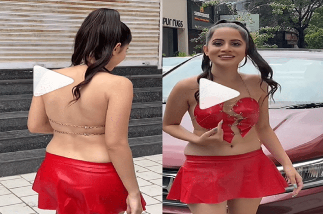 उर्फी जावेद के लेटेस्ट आउटफिट की बात करें तो, इस बार उन्होंने लाल रंग के कट आउट वाले स्कर्ट टॉप को चुना। एक्ट्रेस के आउटफिट को चेन और कुछ अट-आउट की मदद से बनाया गया है, जिसे टूटे (Urfi Javed heart Break emoji) हुए दिल वाली इमोजी का शेप दिया।