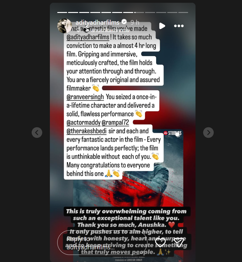 अनुष्का शर्मा की पोस्ट पर रिएक्ट करते हुए आदित्य धर ने लिखा, ‘आप जैसी असाधारण प्रतिभा से ये प्रशंसा पाकर हम सचमुच अभिभूत हैं. आपका बहुत-बहुत धन्यवाद, अनुष्का. इससे हमें और भी ऊंचा लक्ष्य रखने, ईमानदारी, हृदय और उद्देश्य से कहानियां सुनाने और लोगों को सचमुच प्रभावित करने वाली रचनाएं बनाने के लिए निरंतर प्रयास करने की प्रेरणा मिलती है.’ सोशल मीडिया पर आदित्य धर की ये पोस्ट काफी वायरल हो रही है.