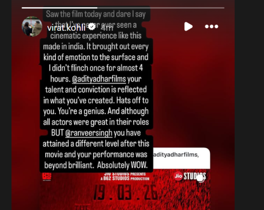 рдХрд┐рдВрдЧ рдХреЛрд╣рд▓реА рдиреЗ рдЗрдВрд╕реНрдЯрд╛ рд╕реНрдЯреЛрд░реА рд╢реЗрдпрд░ рдХрд░рддреЗ рд╣реБрдП рд▓рд┐рдЦрд╛, ‘рдЖрдЬ рдлрд┐рд▓реНрдо рджреЗрдЦреА рдФрд░ рдореИрдВ рдХрд╣рдиреЗ рдХреА рд╣рд┐рдореНрдордд рдХрд░рддрд╛ рд╣реВрдВ рдХрд┐ рдореИрдВрдиреЗ рднрд╛рд░рдд рдореЗрдВ рдмрдиреА рдРрд╕реА рд╕рд┐рдиреЗрдорд╛рдИ рдЕрдиреБрднрд╡ рд╡рд╛рд▓реА рдлрд┐рд▓реНрдо рдкрд╣рд▓реЗ рдХрднреА рдирд╣реАрдВ рджреЗрдЦреА рдереА’. рдЗрддрдирд╛ рд╣реА рдирд╣реАрдВ рдЙрдиреНрд╣реЛрдВрдиреЗ рдЖрдЧреЗ рд▓рд┐рдЦрд╛, ‘рдЗрд╕рдиреЗ рд╣рд░ рддрд░рд╣ рдХреА рднрд╛рд╡рдирд╛ рдХреЛ рд╕рддрд╣ рдкрд░ рд▓рд╛ рджрд┐рдпрд╛ рдФрд░ рдореИрдВ рд▓рдЧрднрдЧ 4 рдШрдВрдЯреЗ рддрдХ рдПрдХ рдмрд╛рд░ рднреА рдирд╣реАрдВ рд╣рд┐рд▓рд╛. @adityadharfilms рдЖрдкрдХреА рдкреНрд░рддрд┐рднрд╛ рдФрд░ рд╡рд┐рд╢реНрд╡рд╛рд╕ рдЖрдкрдХреА рдмрдирд╛рдИ рд╣реБрдИ рдЪреАрдЬ рдореЗрдВ рд╕рд╛рдл рджрд┐рдЦрд╛рдИ рджреЗрддрд╛ рд╣реИ. рдЖрдкрдХреЛ рд╕рд▓рд╛рдо. рдЖрдк рдПрдХ рдЬреАрдирд┐рдпрд╕ рд╣реИрдВ’ рд╡рд┐рд░рд╛рдЯ рдХреЛрд╣рд▓реА рдиреЗ рдЖрдЧреЗ рд▓рд┐рдЦрд╛, ‘рдореИрдВ рдпрд╣ рднреА рдХрд╣рдирд╛ рдЪрд╛рд╣рддрд╛ рд╣реВрдВ рдХрд┐ рд╕рднреА рдХрд▓рд╛рдХрд╛рд░ рдЕрдкрдиреЗ-рдЕрдкрдиреЗ рдХрд┐рд░рджрд╛рд░реЛрдВ рдореЗрдВ рд╢рд╛рдирджрд╛рд░ рдереЗ, рд▓реЗрдХрд┐рди @ranveersingh рдЖрдкрдиреЗ рдЗрд╕ рдлрд┐рд▓реНрдо рдХреЗ рдмрд╛рдж рдПрдХ рдЕрд▓рдЧ рд╣реА рдореБрдХрд╛рдо рд╣рд╛рд╕рд┐рд▓ рдХрд░ рд▓рд┐рдпрд╛ рд╣реИ рдФрд░ рдЖрдкрдХрд╛ рдкреНрд░рджрд░реНрд╢рди рд╢рд╛рдирджрд╛рд░ рд╕реЗ рднреА рдкрд░реЗ рдерд╛.