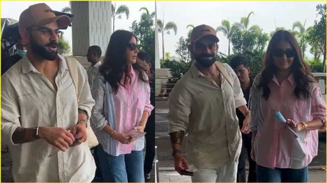 क्रिकेटर विराट कोहली और अनुष्का शर्मा को हाल ही में मुंबई एयरपोर्ट पर स्पॉट किया गया। इस दौरान क्रिकेटर ने व्हाइट पैंट और बेज ओवरशर्ट के साथ कैजुअल लुक लिया हुआ है। अपने लुक को कैप के साथ पूरा किया है। वहीं अनुष्का शर्मा ने क्लासिक ब्लू डेनिम के साथ ओवरसाइज पिंक और ब्लू शर्ट पहनी है। एक्ट्रेस ने अपने बालों को खुला रखा है। दोनों जैसे ही एयरपोर्ट पर एक साथ नजर आए तो पैपराजी उन्हें अपने कैमरे में कैद करने के लिए उतावली हो गई।