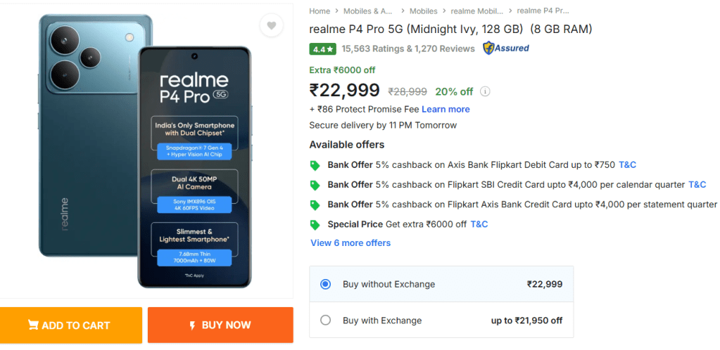 Realme P4 Pro 5G P-सीरीज का एक दमदार स्मार्टफोन है, जो बैटरी और परफॉर्मेंस का अच्छा बैलेंस देता है. इसमें Snapdragon 7 Gen 4 प्रोसेसर दिया गया है. फोन की 7000mAh बैटरी 80W फास्ट चार्जिंग को सपोर्ट करती है. यह डिवाइस Flipkart पर 6 हजार के डिस्काउंट पर 22,999 रुपये में उपलब्ध है.