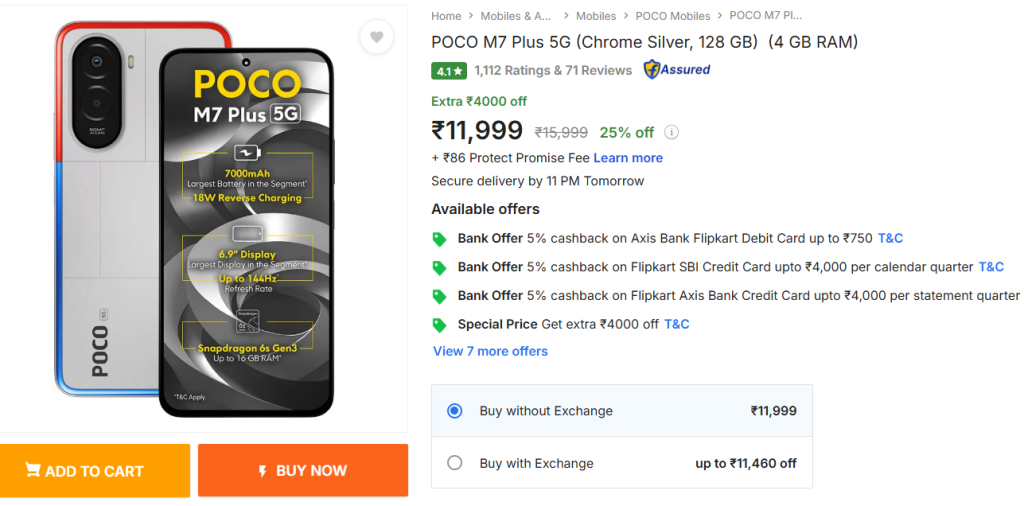अगर आप कम बजट में ज्यादा बैटरी बैकअप चाहते हैं, तो Poco M7 Plus 5G आपके लिए सही ऑप्शन हो सकता है. इस फोन में 7000mAh बैटरी दी गई है, जो 33W फास्ट चार्जिंग और 18W रिवर्स चार्जिंग को सपोर्ट करती है. इसमें 144Hz रिफ्रेश रेट वाला डिस्प्ले भी मिलता है. फ्लिपकार्ट पर यह फोन 11,999 रुपये में खरीदा जा सकता है.