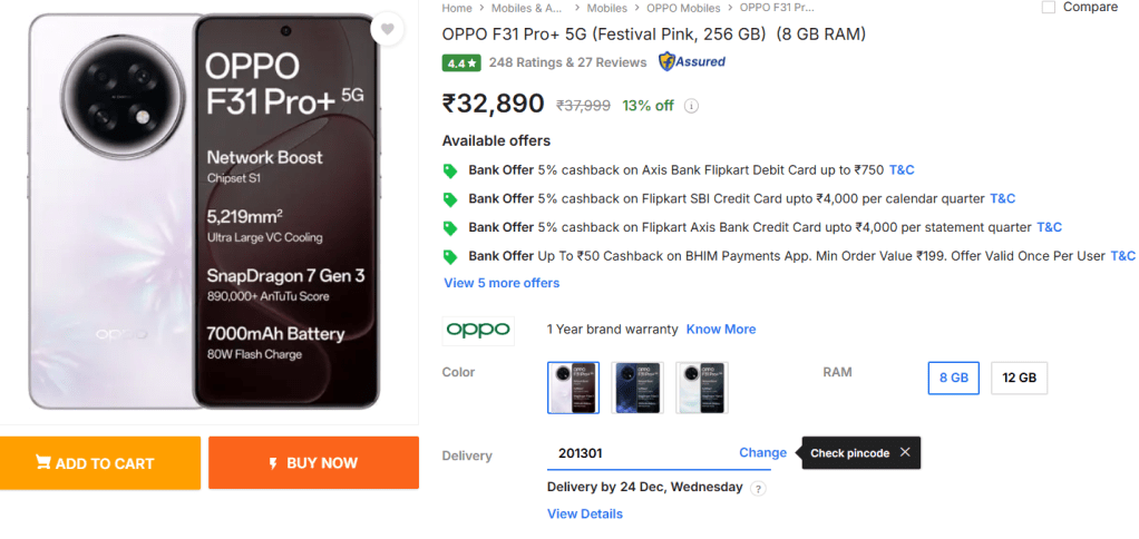 Oppo F31 Pro+ 5G उन यूजर्स के लिए है, जो प्रीमियम डिजाइन के साथ पावरफुल बैटरी चाहते हैं. इस फोन में Snapdragon 7 Gen 3 प्रोसेसर दिया गया है. इसकी 7000mAh बैटरी 80W फास्ट चार्जिंग को सपोर्ट करती है, जिससे फोन काफी कम समय में चार्ज हो जाता है. फिलहाल यह स्मार्टफोन फ्लिपकार्ट पर 32,890 रुपये में उपलब्ध है.