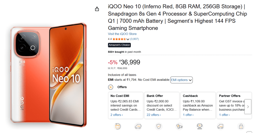 iQOO Neo 10 उन लोगों के लिए है, जो टॉप-लेवल परफॉर्मेंस के साथ बड़ी बैटरी चाहते हैं. इसमें Snapdragon 8s Gen 4 प्रोसेसर दिया गया है. फोन की 7000mAh बैटरी 120W फास्ट चार्जिंग सपोर्ट के साथ आती है, जिससे यह बेहद कम समय में फुल चार्ज हो जाता है. Amazon पर इसकी कीमत 36,999 रुपये रखी गई है.