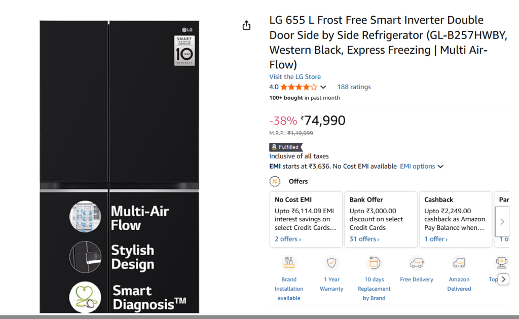 LG का यह 655 लीटर फ्रिज उन लोगों के लिए है जो परफॉर्मेंस और स्पेस दोनों चाहते हैं. इसमें Express Freezing और Multi Air Flow System दिया गया है, जिससे हर कोने में समान कूलिंग मिलती है. Toughened ग्लास शेल्व्स, LED लाइटिंग और Smart Diagnosis जैसी सुविधाएं इसे उपयोग में आसान बनाती हैं.