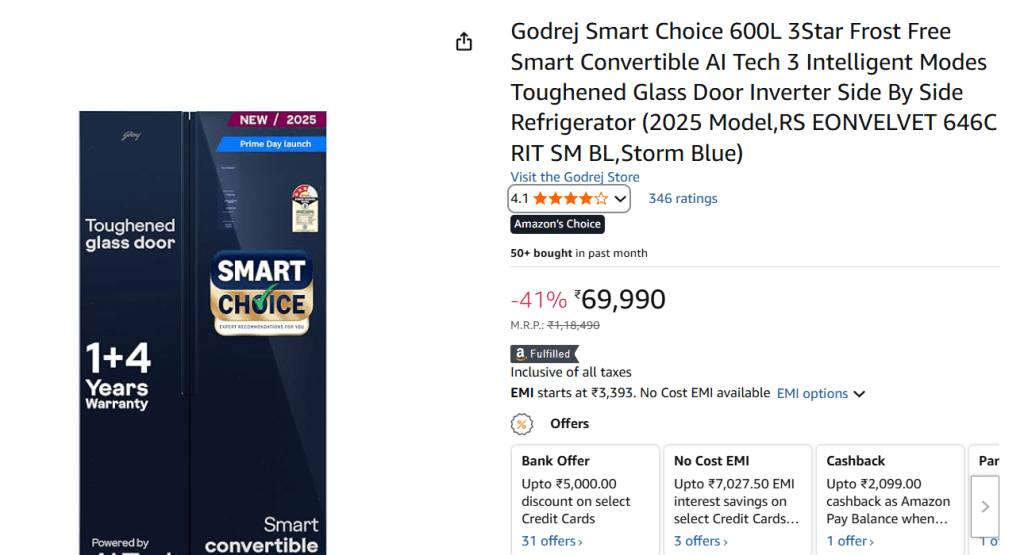 Godrej का यह 600 लीटर कैपेसिटी वाला साइड-बाय-साइड फ्रिज बड़े परिवारों के लिए बेहतरीन विकल्प है. इसमें AI-आधारित इन्वर्टर टेक्नोलॉजी दी गई है जो बिजली की खपत को कम करते हुए बेहतर कूलिंग प्रदान करती है. Toughened ग्लास डोर और LED टच पैनल इसे मॉडर्न लुक देते हैं. इसके साथ Eco, Holiday और Super Freeze जैसे मोड्स मिलते हैं, जिससे आप अपने हिसाब से फ्रिज को एडजस्ट कर सकते हैं.