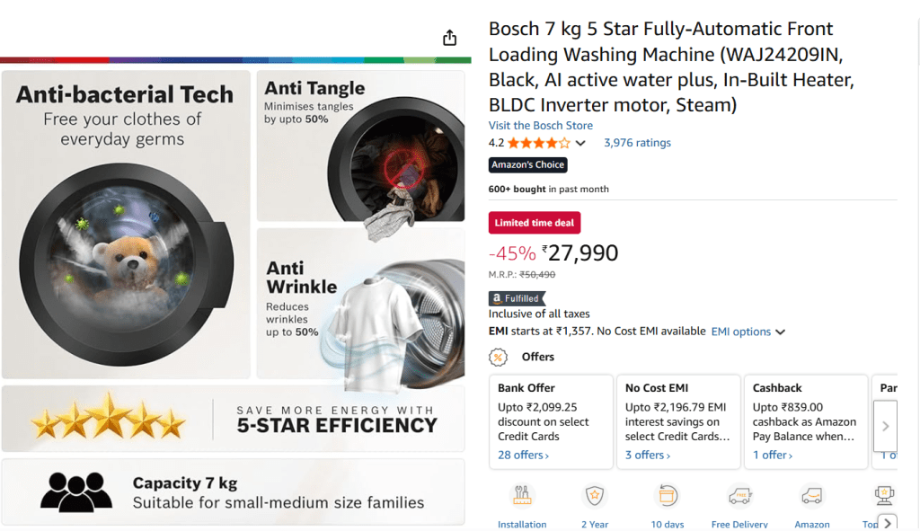 Bosch का यह मॉडल उन लोगों के लिए है जो टिकाऊ और शांत मशीन चाहते हैं. इसमें Active Water Plus AI सिस्टम, BLDC इन्वर्टर मोटर और Steam वॉशिंग फीचर दिया गया है. 15 वॉश प्रोग्राम्स और EcoSilence Drive के साथ यह मशीन मिड-साइज फैमिली के लिए बिल्कुल उपयुक्त है.
