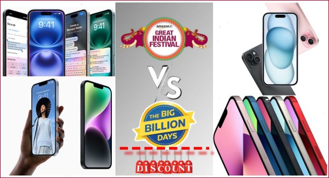 अगर आप भी उन ग्राहकों में से एक हैं जो आईफोन 16, 15, 14 या 13 खरीदने की सोच रहे हैं, लेकिन समझ नहीं आ रहा कि अमेजन ग्रेट इंडियन फेस्टिवल सेल से खरीदें या फ्लिपकार्ट बिग बिलियन डेज सेल पर आईफोन सस्ते में मिलेगा? तो आपकी इस कन्फ्यूज को दूर कर देते हैं और जानते हैं कि कहां पर सबसे कम कीमत में आईफोन मिल रहा है?