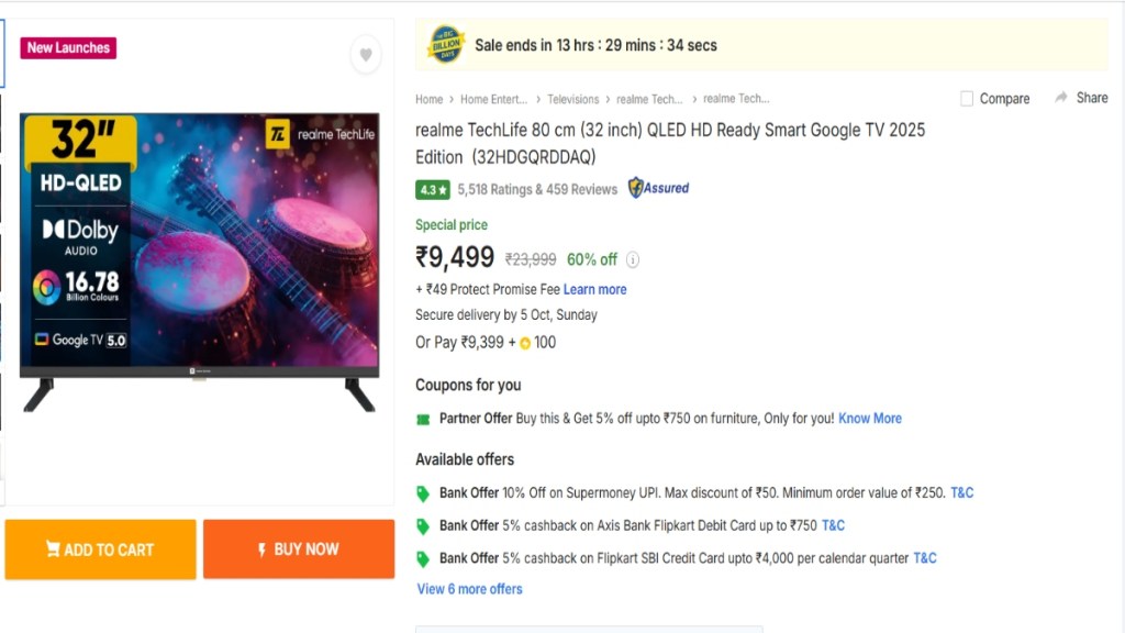 Realme TechLife Smart Google TV 2025 Edition में Google TV ऑपरेटिंग सिस्टम और 26W पावरफुल डुअल स्पीकर्स दिए गए हैं. 32 इंच की स्क्रीन और 60Hz डिस्प्ले के साथ यह टीवी 9,499 रुपये में खरीदा जा सकता है.