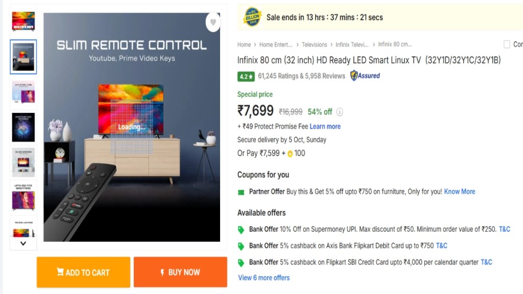 Last day Of Flipkart Sale: ऑनलाइन शॉपिंग प्लेटफॉर्म Flipkart पर चल रही Big Billion Days Sale आज खत्म होने वाली है. अगर आप नया Smart TV खरीदने की सोच रहे हैं तो यह आखिरी मौका है. इस सेल में 10,000 रुपये से कम कीमत में आप Realme, Motorola, Philips, Infinix जैसे ब्रैंड्स के फ्रेमलेस और स्मार्ट टीवी खरीद सकते हैं.