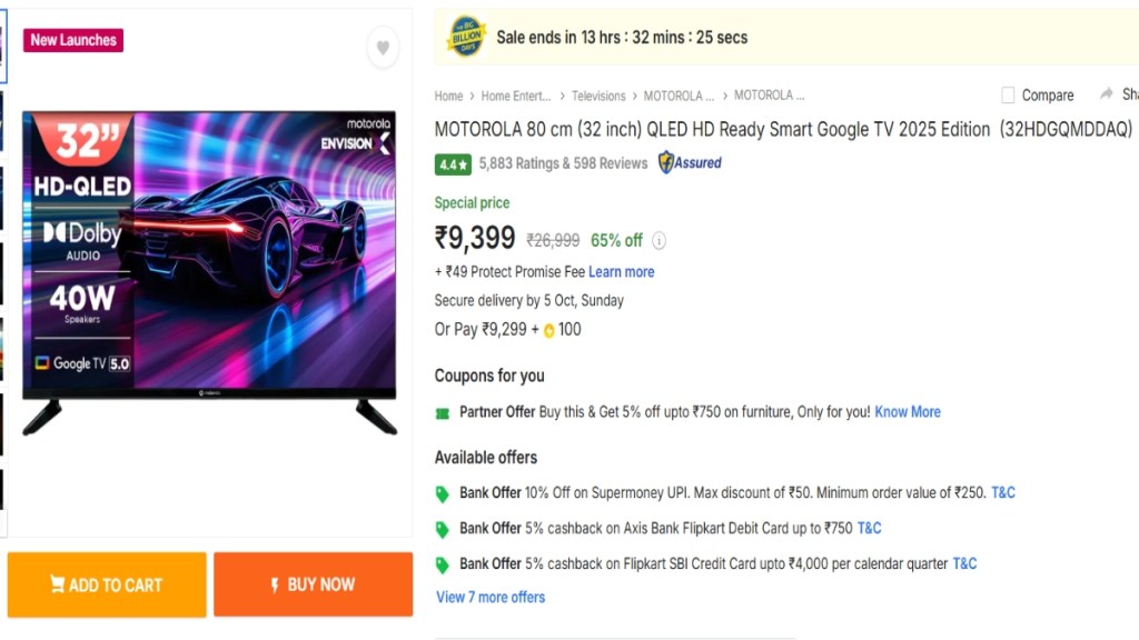 Motorola QLED HD Ready Smart Google TV 2025 Edition में 40W डुअल स्पीकर्स और Google TV 5.0 ऑपरेटिंग सिस्टम है. 32 इंच स्क्रीन के साथ यह टीवी अब डिस्काउंट के बाद 9,399 रुपये में उपलब्ध है.