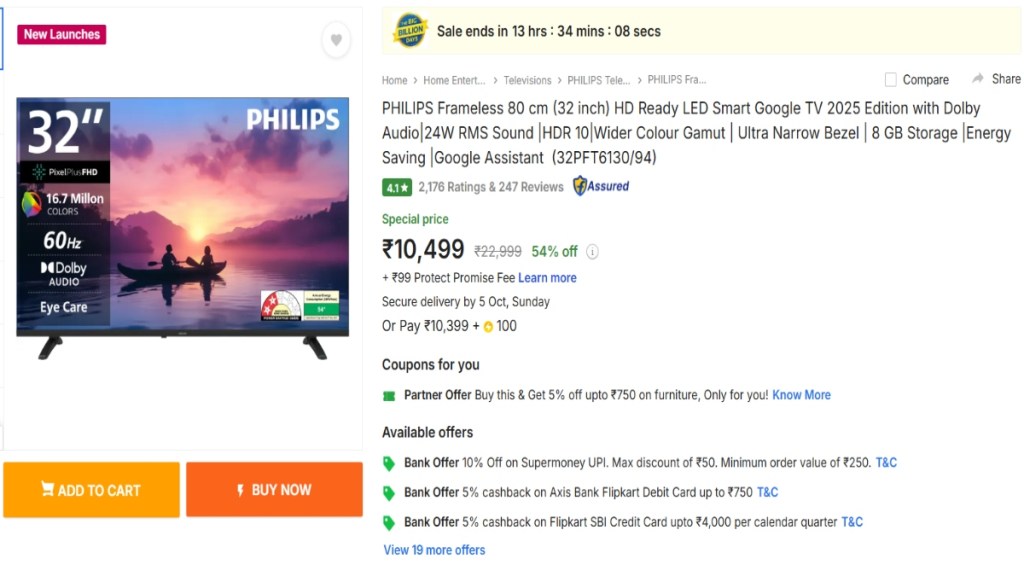 Philips Frameless Smart Google TV 2025 Edition की लिस्टेड कीमत 10,499 रुपये है, लेकिन बैंक ऑफर्स के बाद यह 10 हजार से कम में मिल सकता है. इसमें 24W स्पीकर्स, Dolby Audio सपोर्ट, 8GB रैम और Google Assistant सपोर्ट मौजूद है.