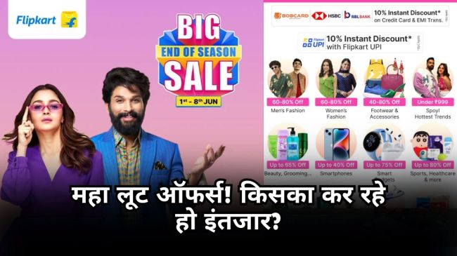 Flipkart Big End of Season Sale: फ्लिपकार्ट एक बार फिर अपनी जबरदस्त सेल ऑफर्स के साथ वापस आ गया है। कंपनी ने हाल ही में Flipkart Big End of Season Sale का ऐलान किया था जो आज यानी 1 जून से शुरू हो गई है। सेल में कंपनी ने इस बार सबसे ज्यादा फोकस फैशन प्रोडक्ट्स पर रखा है। हालांकि सेल में कई अन्य सेक्शंस भी हैं, जिसमें कंज्यूमर्स को खास डील्स देखने को मिलने वाली हैं। कुछ प्रोडक्ट्स पर तो 80 परसेंट तक डिस्काउंट मिल रहा है। सेल में स्मार्टफोन और स्मार्टवॉच भी काफी सस्ते में मिल रही हैं। चलिए सेल के ऑफर के बारे में जानते हैं...